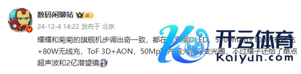 【CNMO科技讯息】12月3日,数码博主“数码座谈站”发文称,菊菊(华为)和耀耀(荣耀)的旗舰机型要领特等一致,齐配备了双层OLED技艺的表露屏幕,内置5700mAh大容量电板,复古100W有线快速充电和80W无线充电,复古ToF 3D+AON,后置50Mp国产超大底可变光圈镜头。不外,荣耀旗舰机型还配备了单点超声波指纹模组和2亿像素的潜望式长焦镜头。