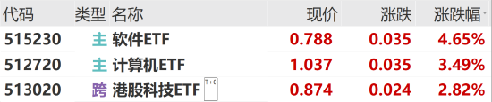 本日科技板块再度高涨,软件板块带头高涨。软件ETF(515230)涨4.65%,臆测机ETF(512720)涨3.49%。