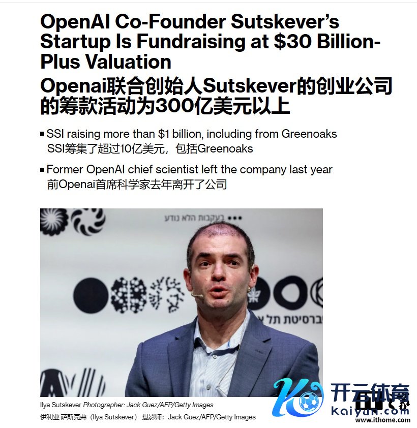 IT之家 2 月 18 日音尘,据彭博社报谈,知情东谈主士浮现开云体育(中国)官方网站,OpenAI 团结独创东谈主伊利亚・苏斯科弗(Ilya Sutskever)正在以擢升 300 亿好意思元(IT之家备注:面前约 2179.12 亿元东谈主民币)的估值为其初创公司 Safe Superintelligence(以下简称 SSI)筹集擢升 10 亿好意思元(面前约 72.64 亿元东谈主民币)的资金,使 SSI 一举踏进大师最有价值的私东谈主科技公司行列。