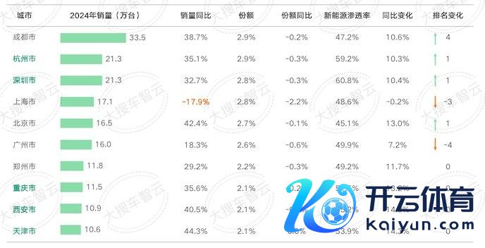 受新能源车申领绿牌条目调整的影响,2024年上海市新能源车销量跌出榜首,下降至第4位,销量同比下滑17.9%,TOP10城市中唯独销量下滑的城市,份额同比下滑2.2%。杭州市、深圳市、重庆市、西安市、天津市等城市新能源车销量仍是超过燃油车,其中深圳市新能源渗入率达60.8%,为宇宙最高。
