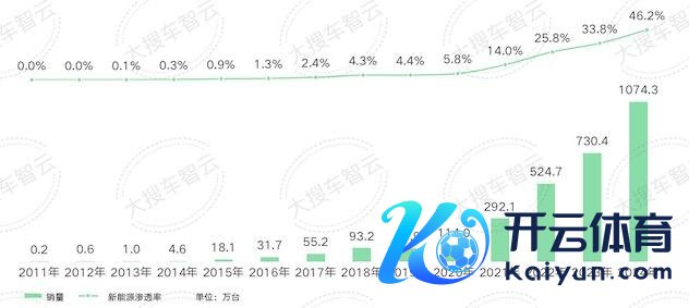 在国度“补贴、限牌、限行”等计谋指示下,新能源车质料增强、本钱缩短配景下,以及产物种类丰富加执下,十多年技能,中国新能源车销量由万台驾御增长至1000万台,市集渗入率由0稳步耕种到46.2%,2024年新能源车销量1074.3万台,销量再改进高,同比增长47.1%。