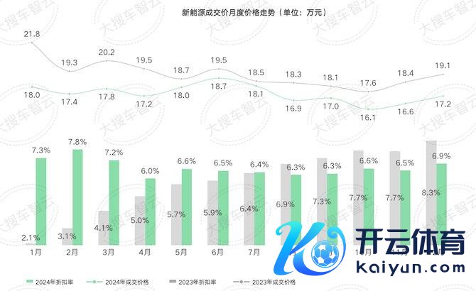 跟着能源电板原材料价钱下落,整车制酿本钱缩短,以及新能源车增速放缓,车企纷繁下调价钱以刺激末端破钞,价钱战连气儿全年,成为汽车市集主旋律。对比2023年,2024年各月价钱均低于同期。2024年新能源车价钱虽有所波动,但举座呈现下落态势,其中6月增长至全年最高,平均成交价18.7万元,下半岁首始下落,至10月达到全年最低,平均成交价16.1万元,11-12月价钱再次反弹。