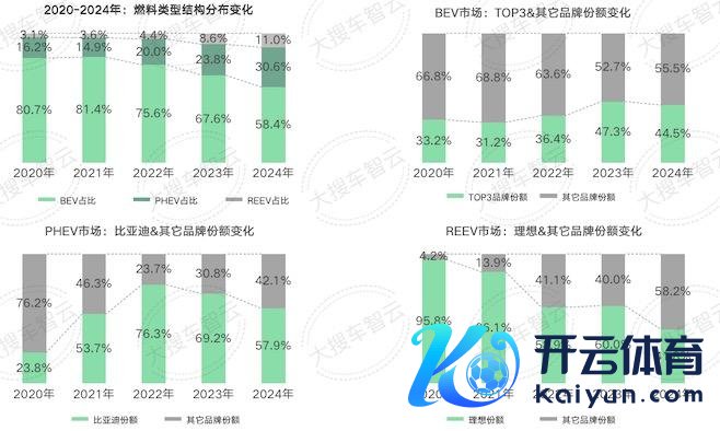 BEV虽稳居主导地位,但资历3年的发展,份额由2021年81.4%下滑至2024年58.4%,降幅超两成;与此同期,PHEV和增程式稳步增长,其中PHEV涨势昭彰,2024年份额同比增长6.8%。近两年来,跟着其它车企的发力,比亚迪、理思各闲适PHEV和REEV规模份额执续下落,行业地位正面对挑战。