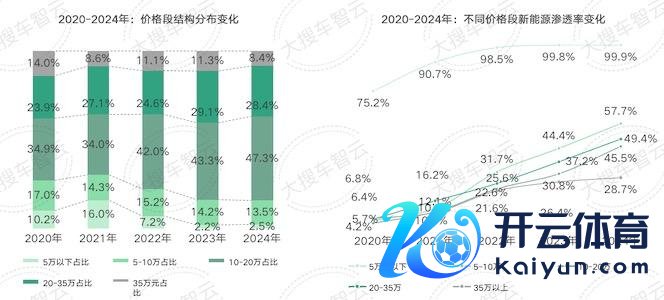 资历多年的下逾期,5万以下价钱段市集份额初始止跌回稳,新能源渗入率超90%,已基本兑现电动化;5-10万市集价钱段占比变化不大,但2024年新能源车销量已超过燃油车销量。10-20万元为新能源车主流价钱段,份额由2020年34.9%增长至2024年47.3%,但新能源渗入率45.5%,低于市集举座水平。35万元以上新能源渗入率不到30%,远低于行业举座水平,市集后劲有待进一步挖掘。