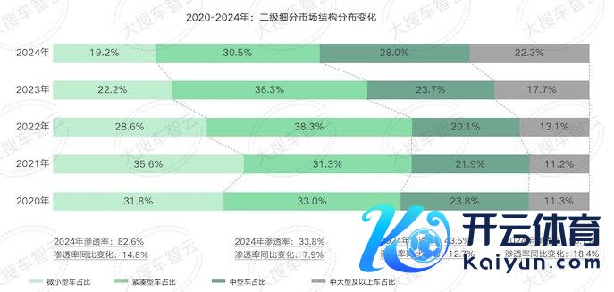 跟着市集趋近富裕,近两年微袖珍车遏抑萎缩,跌至两成以下,但新能源渗入率超80%,基本兑现电动化;紧凑型车虽占据新能源市集主流地位,但份额执续下滑,由2022年38.3%下降至2024年30.5%,新能源渗入率33.8%,低于其它细分市集。中型及以上细分市集份额执续高潮,由2022年33.1%增长至2024年50.3%(仍是超过微袖珍和紧凑型市集的总额),增幅达17.2%。