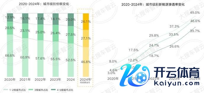 新能源车市集由1-2线城市逐渐向3-5线城市下千里,2024年其占比已耕种至47.5%,但参考传统燃油车市集(53.2%),该比例相对偏低,尤其是4-5线城市,可见低线城市仍有较大发展空间。以“宇宙新能源渗入率走势”为参考线,各级别城市走势紧随宇宙大盘,但新能源普及率出现分化,1-2线城市新能源普及率最初宇宙,4-5线城市有所滞后,低于宇宙平均水平。